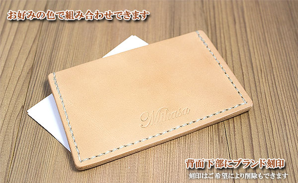 縦約65mm×横約107mm×厚さ約4mm 重量約25g ◎ポケット(1ヶ所) やわらかなカーブを描いた取り出し口のある名刺入れ1ヶ所。 ![]() ![]() ![]() ![]() ![]() 色はナチュラル・チョコ・ブラック・レッド・グリーン・オレンジの6色よりお選びください。 糸色との組み合わせで72通りあり、自分好みの組み合わせを楽しめます。 一番人気は落ち着いた色のチョコカラーです。色合いに深みのあるレッドカラーも人気急上昇!