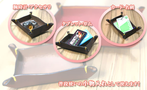 ![]() ![]() 栃木レザーと天然麻糸のみで作り出したかわいいレザートレイミニ(レザー小物入れ)です。 自然な風合いの天然麻糸と、手に馴染みやすいしっとりとしたオイルレザーを職人がひとつひとつ手間を惜しまず切り出し面(コバ)を丹念に磨き仕上げました。 レディース腕時計、アクセサリ、タブレット、ガム、カード、名刺などの小さな小物達を天然ヌメ革でできたトレイに入れられます。 コーナーの止め具には天然麻糸によってよりハンドメイドのぬくもりと素朴さが伝わってきます。 また、別途大きなサイズのレザートレイもございますのでお好みでお選び下さい。 ★栃木レザーと天然麻糸のみで作り出した「レザートレイ プレーン」はこちら ★栃木レザーと天然麻糸そして印象的な真鍮金具を使用した「レザートレイ ソリッドブラス」はこちら