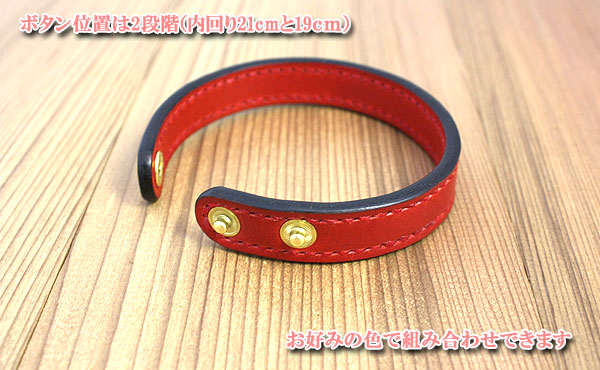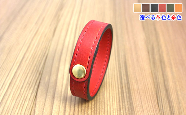 ![]() ![]() 選べる革色と麻糸のステッチ、天然ヌメ革レザーブレスレットです。 お好みで選べる両面革張りの革色と麻糸のステッチカラーに真鍮製バネホックが輝く、手に馴染むオイルレザーの感触。 止めホックは約19cmと約21cmの2箇所ありますのでレディース・メンズで使い分けることもできます。 革の端(コバ)と背面(床面)も職人が丁寧に仕上げました。 写真は革色糸色共にレッドカラーとなっております。 革色をナチュラルカラーで選択した場合は、内装も外装もナチュラルカラーのみとなります。 ![]() ![]() ◎サイズ重量(内回りは約190mmtと約210mmの二段階) 縦約227mm×横約15mm 重量約15g ◎アタッチメント(総真鍮製) 使いやすくコンパクトなボタンはバネホック式の総真鍮製です。 真鍮製ボタンの特性である、時と共にともに表情が変わりゆくエイジング(経年変化)をお楽しみください。 ![]() 色はナチュラル・チョコ・ブラック・レッド・グリーン・オレンジの6色よりお選びください。 糸色との組み合わせで72通りあり、自分好みの組み合わせを楽しめます。 一番人気は落ち着いた色のチョコカラーです。色合いに深みのあるレッドカラーも人気急上昇!